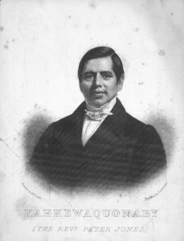 JONES, PETER (connu en sauteux sous le nom de Kahkewaquonaby, qui signifie « plumes sacrées » ou « plumes sacrées et ondoyantes » ; connu aussi en agnier sous le nom de Desagondensta, qui signifie « il fait tenir le peuple debout »), chef sauteux de la tribu des Mississagués, membre du totem de l’Aigle, ministre méthodiste, fermier, écrivain et traducteur, né le 1er janvier 1802 à Burlington Heights (Hamilton, Ontario) ; le 8 septembre 1833, à New York, il épousa Elizabeth Field*, et ils eurent cinq fils, dont quatre survécurent à la première enfance ; décédé le 29 juin 1856 près de Brantford, Haut-Canada.