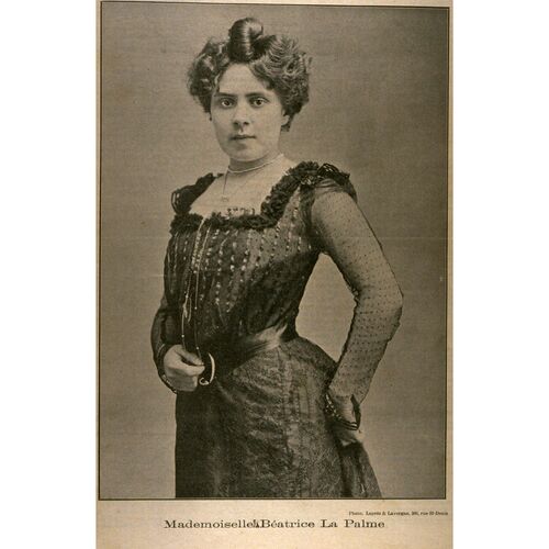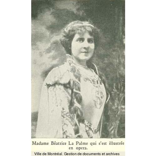 En 1881, la famille de Béatrice La Palme s’installe à Montréal, où son père travaille comme agent d’immeubles et entrepreneur de bâtiment. Béatrice fait ses études primaires au pensionnat d’Hochelaga (Montréal) des Sœurs des Saints-Noms de Jésus et de Marie, puis les continue à leur école de la rue Cherrier. Initiée à la musique par sa mère et par les religieuses, Béatrice prend des leçons de musique avec Alexis Contant* puis elle étudie le violon avec Charles Lejeune et Frantz Jehin-Prume*. Elle donne son premier récital le 5 mars 1894 (accompagnée par Joseph Saucier). Elle est la première récipiendaire en 1895 de la bourse Strathcona (créée cette année-là par Donald Alexander Smith*, futur baron Strathcona et Mount Royal) qui lui permet d’étudier au Royal College of Music, en Angleterre, durant cinq ans. Elle y travaille le violon avec l’Espagnol Enrique Fernández Arbós et commence des leçons de chant avec Gustave García. En 1900, elle est la première Canadienne française à mériter le titre de membre correspondant du Royal College of Music. De retour à Montréal la même année, elle présente le 11 octobre un concert à la fois comme violoniste et chanteuse. Elle retourne en Angleterre où, sur les conseils d’Emma Albani [Lajeunesse], elle se consacre désormais exclusivement au chant, qu’elle perfectionne auprès de Nelly Rowe, élève de Mme Mathilde Marchesi.