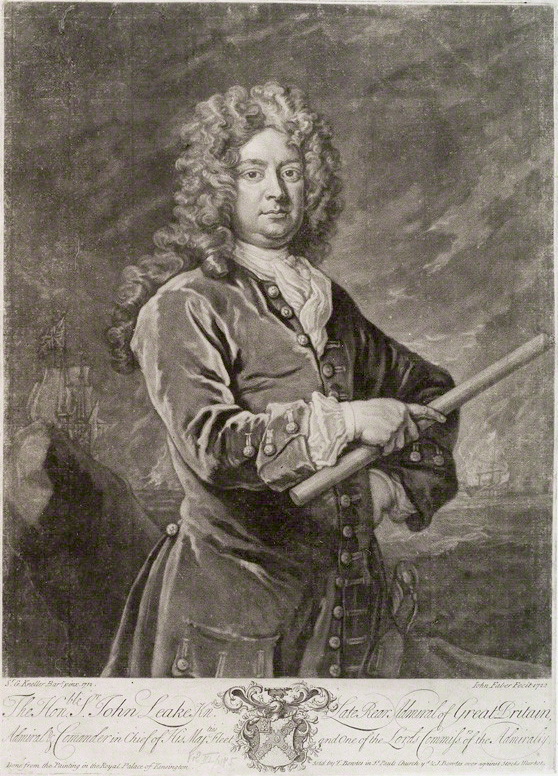 LEAKE, sir JOHN, amiral de la flotte, commodore du convoi de Terre-Neuve et gouverneur temporaire en 1702, né en 1656 à Rotherhithe dans le comté de Kent, second fils du capitaine Richard Leake et de Christian Hill, fille du capitaine Richard Hill, décédé le 21 août 1720 à Greenwich, inhumé à Stepney.