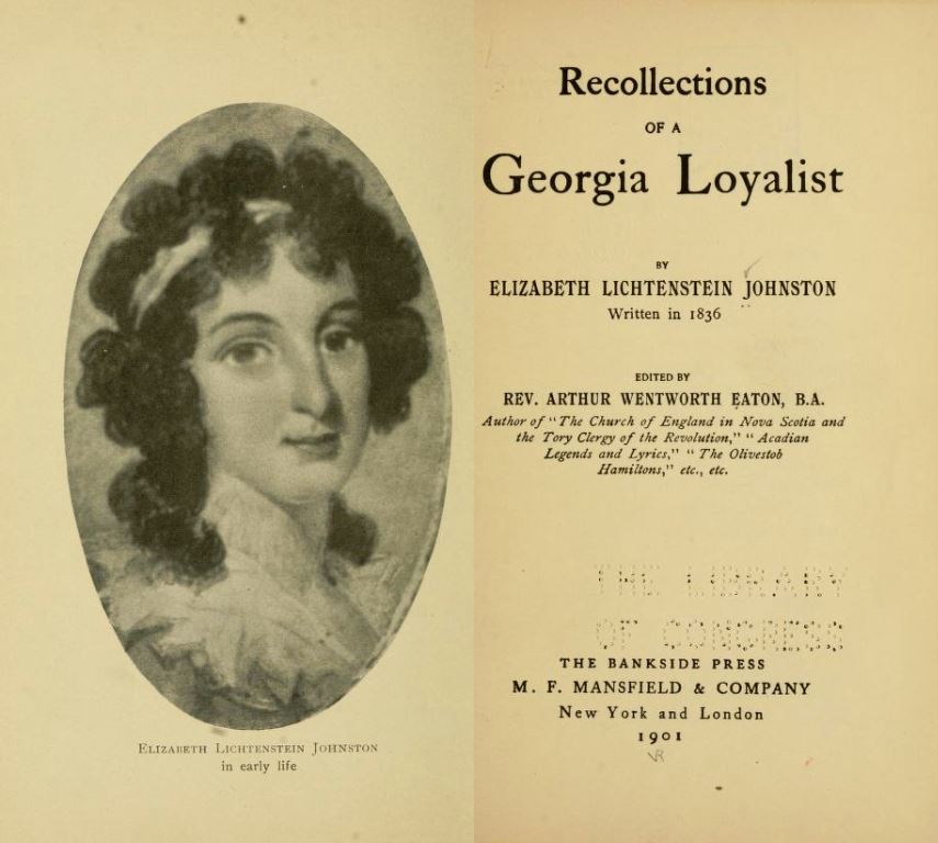 L’ouvrage d’Elizabeth Lichtenstein Johnston, Recollections of a Georgia loyalist, a été édité par Arthur Wentworth Hamilton Eaton* et publié à New York et à Londres en 1901.