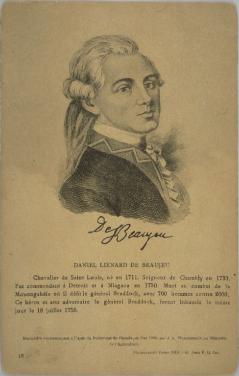 LIÉNARD DE BEAUJEU, DANIEL-HYACINTHE-MARIE, officier dans les troupes de la Marine, seigneur, entrepreneur, né le 9 août 1711 à Montréal, fils de Louis Liénard de Beaujeu et de Thérèse-Denise Migeon de Branssat, tué au combat près du fort Duquesne (Pittsburgh, Penn.) le 9 juillet 1755.