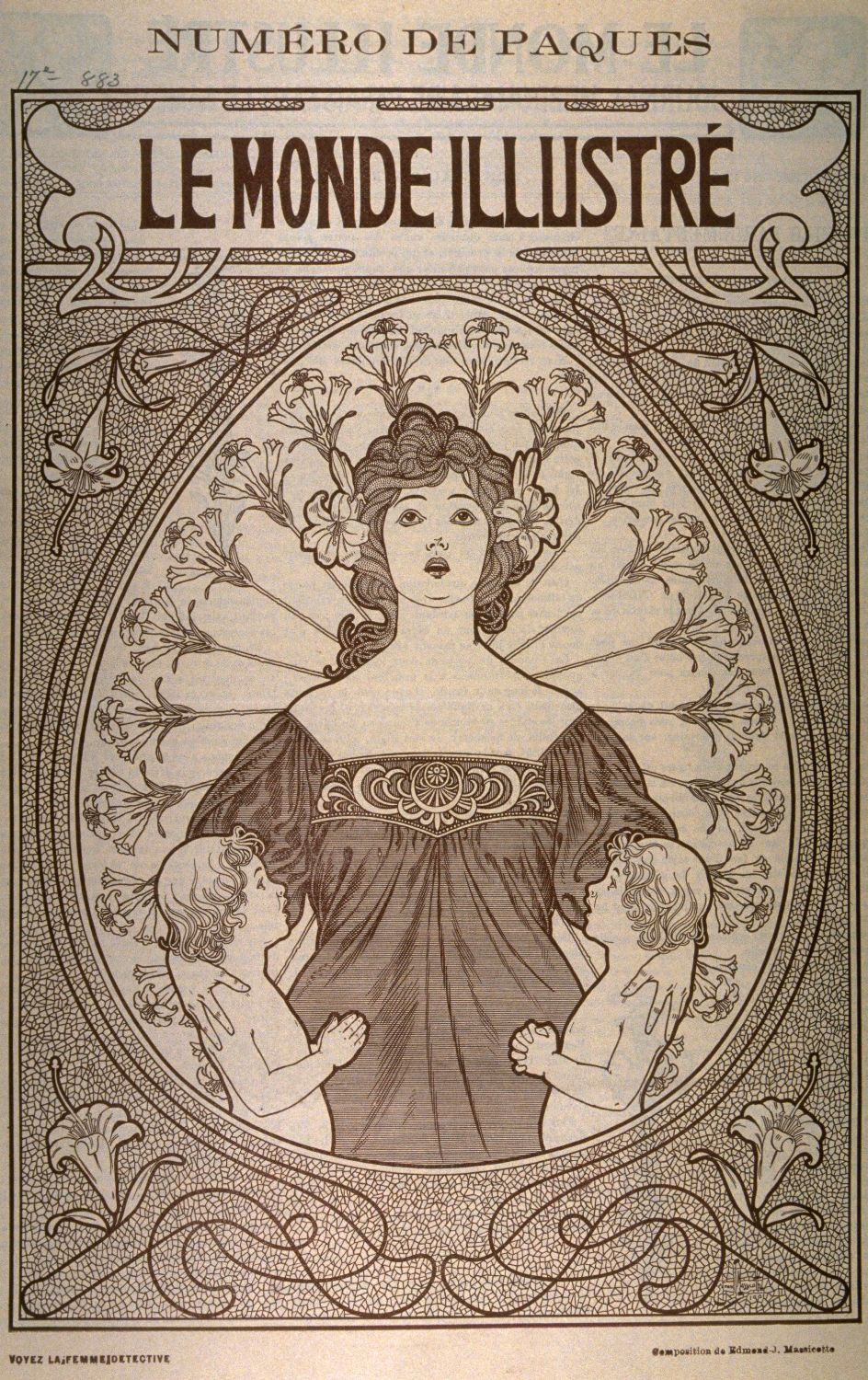 Le style international appelé Art nouveau, où la ligne sinueuse traduit la volupté des personnages, marquerait fortement, dans un premier temps, la production d’Edmond-Joseph. Pour sa rapide conversion, il fut sans doute redevable à Édouard-Zotique, qualifié à l’époque de « jeune barbare » en raison de son attachement au mouvement symboliste européen. Le titre historié et la figure allégorique que l’illustrateur dessina vers 1895 pour la page couverture de l’Écho des jeunes, revue lancée à Sainte-Cunégonde en 1891 et à laquelle collaborait Édouard-Zotique, apparurent comme l’emblème de la direction que les arts visuels prendraient aux côtés de la nouvelle littérature québécoise d’inspiration « décadente ». Malgré la courte durée de la révolte littéraire d’Édouard-Zotique, Edmond-Joseph s’appliquerait durant une douzaine d’années encore à apprivoiser un modernisme utile à son métier d’illustrateur.