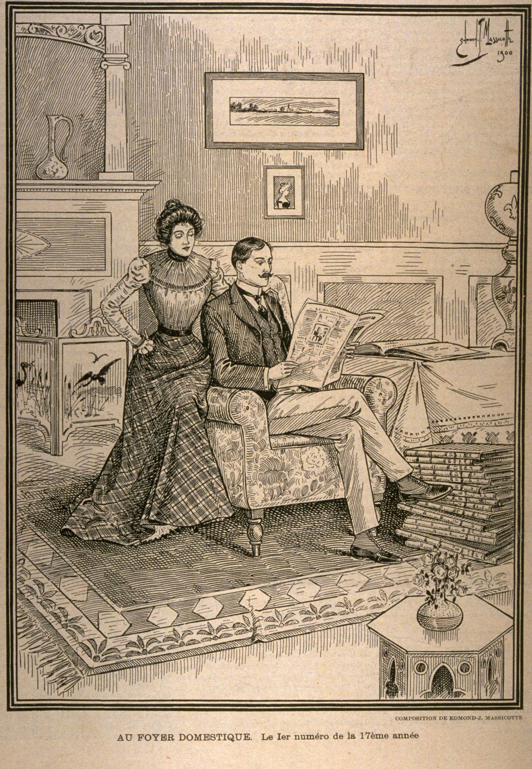 Les illustrations à caractère publicitaire d'Edmond-Joseph Massicotte attendent toujours que l'inventaire en soit fait. On sait, par exemple, que ce dernier réalisa de 1906 à 1908 de nombreuses annonces pour la Compagnie d'auvents des marchands Limitée. Outre l'ouvrage de son frère Édouard-Zotique intitulé la Cité de Sainte-Cunégonde de Montréal : notes et souvenirs (Montréal, 1893), Edmond-Joseph Massicotte illustra plusieurs autres livres, à commencer par celui de Wenceslas-Eugène Dick, Un drame au Labrador (Montréal, [1897 ?]), où son style rappelle le réalisme européen tardif. Deux ans plus tard parut Monographies de plantes canadiennes, suivies de Croquis champêtres et d'un calendrier de la flore de la province de Québec (Montréal, 1899) d'Édouard-Zotique ; pour cette réalisation, le dessinateur visa une précision quasi scientifique. Dans la même veine, il illustra Cent fleurs de mon herbier : études sur le monde végétal à la portée de tous, suivies d'un calendrier de la flore de la province de Québec (Montréal, 1906), également de son frère, où il reprit des illustrations, Nos fleurs canadiennes, parues d'abord dans le Monde illustré (Montréal) du 30 juill. 1893 au 22 juin 1901. Il fit quatre dessins pour les Contes vrais (2e éd., Montréal, 1907) de Pamphile Le May*, dessina à la plume 16 portraits pour l'ouvrage de son frère, Conteurs canadiens-français du xixe siècle (Montréal, 1902), livra pour publication les illustrations d'un roman de Laure Conan [Félicité Angers], À l'œuvre et à l'épreuve (3e éd., Montréal, 1914), dessina 22 illustrations pour le livre d'Auguste Tressol, dit frère Théodule, Mes premières leçons de rédaction (Montréal, 1914), orna de ses dessins Récits laurentiens (Montréal, 1919) et Croquis laurentiens (Montréal, 1920) du frère Marie-Victorin [Conrad Kirouac*], de même que l'ouvrage de Constant Doyon, Au régime de l'eau (Québec, 1919).