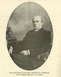 Fils d’un magistrat et diacre baptiste du comté de Hants, Daniel McNeill Parker passa six ans à l’école publique à Petite avant de fréquenter la King’s College School et la Horton Academy. Il s’initia à la médecine en faisant un stage auprès de William Bruce Almon*, à Halifax. Là, il apprit à préparer et à administrer des médicaments, à faire des pansements, à extraire des dents et, finalement, à prescrire des traitements. En 1842, il entra à la University of Edinburgh, où il rédigea une thèse intitulée « The management of parturition ». En 1845, il reçut la médaille d’or d’anatomie et obtint son diplôme de justesse à cause d’une dispute avec le professeur de botanique. Au cours de son séjour à Édimbourg, il passa ses vacances d’été à travailler comme aide-clinicien auprès du célèbre médecin James Young Simpson.