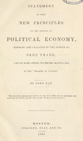 Entre temps, Rae poursuivait la préparation de son livre. Il se rendit à Boston en 1834 et sur les conseils d’un certain nombre d’hommes de lettres, dont Alexander Hill Everett, le rédacteur de la North American Review, il décida de publier d’abord l’appendice comme une œuvre à part. L’ouvrage parut en 1834 sous le titre de Statement of some new principles on the subject of political economy exposing the fallacies of the system of free trade, and of some other doctrines maintained in the « Wealth of Nations ».