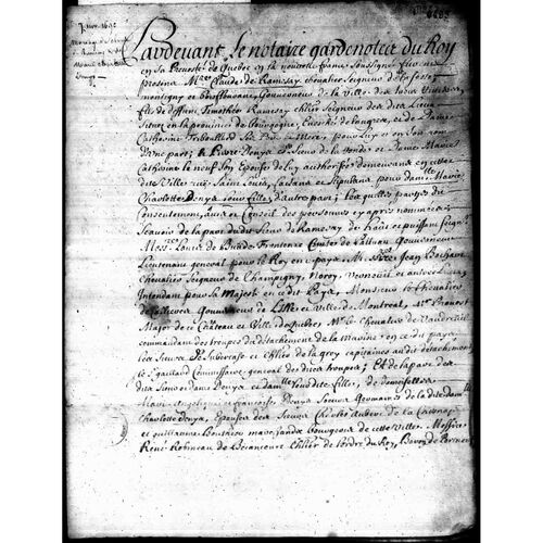 Claude de Ramezay était le fils de Timothé de Ramezay et de Catherine Tribouillard, fille d’Hilaire Tribouillard, argentier des écuries du prince de Condé. Arrivé au Canada en 1685, en qualité de lieutenant dans les troupes de la marine, il fut promu capitaine deux ans plus tard. Le 8 novembre 1690, il épousa, à Québec, Marie-Charlotte Denys, fille de Pierre Denys de La Ronde et de Catherine Leneuf, s’alliant ainsi à une des éminentes familles de la Nouvelle-France. Quelques mois plus tôt, il avait obtenu le poste de gouverneur de Trois-Rivières en versant 3 000# à la veuve démunie du titulaire précédent, feu René Gaultier* de Varennes. Moins de cinq ans après son arrivée dans la colonie, Ramezay tenait une place enviable dans la haute société de la Nouvelle-France.