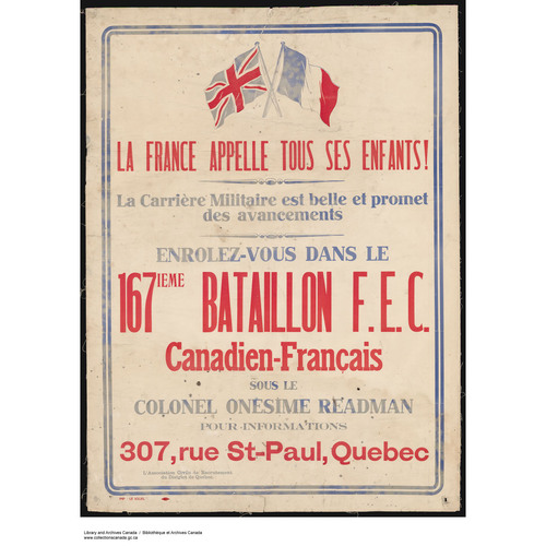 Quelques mois plus tard, après avoir rencontré le ministre Pierre-Édouard Blondin*, Readman demanda à sir Samuel Hughes*, ministre de la Milice et de la Défense, la permission de lever un bataillon. Au lieu de s’appuyer sur les régiments de milice, comme on le ferait pendant le deuxième conflit mondial, Hughes avait décidé de créer de nouvelles unités d’infanterie numérotées de 1 à 258. Quatorze d’entre elles seraient des unités francophones. La première à voir le jour avait été le 22e bataillon d’infanterie au mois d’octobre 1914. Autorisé en principe, le 17 décembre 1915, à recruter son unité à la grandeur de la province de Québec, Readman ne parvint jamais à remplir les rangs du 167e bataillon. Il faut dire que d’autres bataillons francophones se formaient à la même époque et que, après le premier trimestre de l’année 1916, la période noire du recrutement allait commencer.