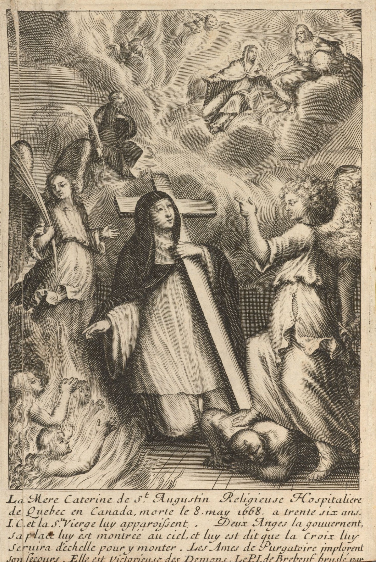 Mère Catherine, débordante d’activité, discrète et de belle humeur, ne manifeste pas de signes d’un trouble de santé mentale. Conscient d’écrire un livre propre à soulever des controverses, le père Ragueneau commence par des avis au lecteur. Dans cette apologie liminaire, mère Catherine apparaît parfaitement équilibrée, à l’abri de tous les pièges de l’imagination. Cette biographie s’ouvre sur une image symbolique gravée à la demande de Mgr de Laval. En bas, on aperçoit Satan et les âmes du purgatoire ; au centre, des anges et mère Catherine tenant une grande croix ; dans le ciel, le père de Brébeuf, une palme à la main ; au sommet, la Vierge et Jésus-Christ. Sorte de raccourci biographique, cette image ne fait pas fortune au xxe siècle. À cette iconographie compliquée, nous préférons le visage délicat de mère Catherine de Longpré, celui qui orne le petit oratoire de l’Hôtel-Dieu de Québec. Vive, délurée, cette délicieuse petite Normande s’est élancée au paradis au galop de l’héroïsme. Qu’on la présente surtout comme missionnaire en terre lointaine, comme infirmière, comme femme entreprenante, morte le Te Deum aux lèvres. Et mère Catherine sortira glorieuse de l’ombre pour rassurer théologiens et psychiatres.