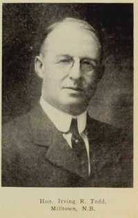 TODD, IRVING RANDALL, marchand de bois, manufacturier, homme d’affaires et homme politique, né le 15 décembre 1861 à Milltown (St Stephen-Milltown, Nouveau-Brunswick), aîné des enfants de Charles Frederick Todd et d’Anna Maria Porter ; le 21 juin 1883, il épousa à St Stephen (St Stephen-Milltown) Frances Esther Boardman (décédée le 25 février 1936), et ils eurent un fils ; décédé le 27 décembre 1932 à Milltown.