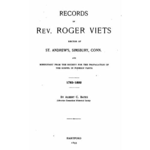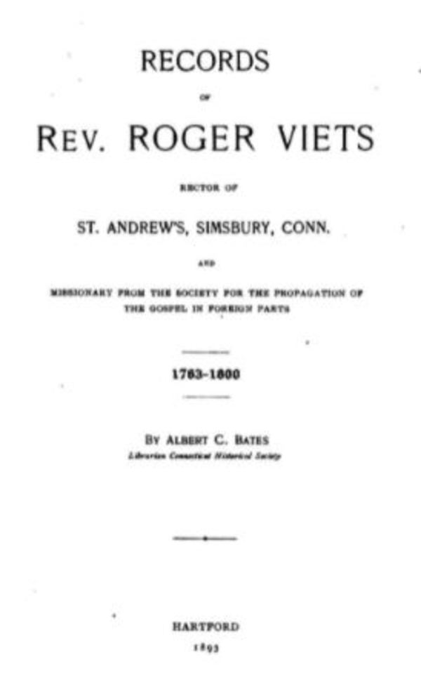 Roger Viets est l’auteur de : Annapolis-Royal (Halifax, 1788 ; réimpr. avec introd. de T. B. Vincent, Kingston, Ontario, [1979]) ; A serious address and farewell charge to the members of the Church of England in Simsbury and the adjacent parts (Hartford, Conn., 1787) ; A sermon, on the duty of attending the public worship of God ; preached at Digby in Nova-Scotia, April 19th, 1789 (Hartford, 1789) ; A sermon preached at Hartford, on Lords-day, December 30th, 1764 (Hartford, 1765) ; A sermon, preached at Sissaboo, now called Weymouth, in Nova-Scotia, on the 15th October, 1797 (Saint-Jean, N.-B., 1799) ; A sermon, preached before the lodge of Free and Accepted Masons, at Granby [...] called St. Mark’s Lodge ; on the 9th July, 1800 (Hartford, 1800) ; A sermon, preached in St. Andrew’s Church, Simsbury, in New-England, on April 9th, 1784 ; being the anniversary of the crucifixion of Christ, commonly called Good-Friday (Hartford, 1787) ; A sermon, preached in St. Peter’s Church, in Granby, formerly Simsbury, in Connecticut, New-England, on the 29th day of June 1800 (Hartford, 1800) ; et A sermon preached to the ancient and worshipful society of Free and Accepted Masons, at their anniversary festival of the blessed evangelist St. John, 1792, in Trinity Church, Digby, Nova-Scotia (Halifax, 1793). Ses registres d’église ont également été publiés sous le titre de Records of Rev. Roger Viets, rector of St. Andrews, Simsbury, Conn., and missionary from the Society for the Propagation of the Gospel in Foreign Parts, 1763–1800, A. C. Bates, édit. (Hartford, 1893). On trouve des manuscrits de Viets aux APC, MG 23, Dl, sér. 1, 14, et à l’Univ. of King’s Collège Library (Halifax). [t. b. v.]