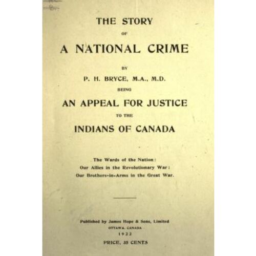 LAC, RG 10, vol.3957, file 140754-1, “Notes on Dr. Bryce’s report – with suggestions for future action,” 7 March 1910. A. J. Green, “Humanitarian, m.d.: Dr. Peter H. Bryce’s contributions to Canadian federal native and immigration policy, 1904–1921” (ma thesis, Queen’s Univ., Kingston, Ont., 1999). M. K. Lux, Medicine that walks: disease, medicine, and Canadian plains native people, 1880–1940 (Toronto and Buffalo, N.Y., 2001). J. R. Miller, Shingwauk’s vision: a history of native residential schools (Toronto and Buffalo, 1996). J. S. Milloy, “A national crime”: the Canadian government and the residential school system, 1879 to 1986 (Winnipeg, 1999). Alan Sears, “Immigration controls as social policy: the case of Canadian medical inspection 1900–1920,” Studies in Political Economy (Ottawa), 33 (1990): 91–112. Megan Sproule-Jones, “Crusading for the forgotten: Dr. Peter Bryce, public health, and prairie native residential schools,” Canadian Bull. of Medical Hist. (Waterloo, Ont.), 13 (1996): 199–224. E. B. Titley, A narrow vision: Duncan Campbell Scott and the administration of Indian Affairs in Canada (Vancouver, 1986). Mariana Valverde, The age of light, soap, and water: moral reform in English Canada, 1885–1925 (Toronto, 1991). G. J. Wherrett, The miracle of the empty beds: a history of tuberculosis in Canada (Toronto, 1977).