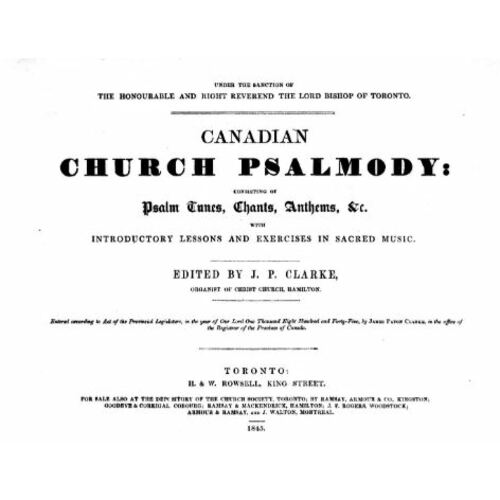 Canadian church psalmody: consisting of psalm tunes, chants, anthems, etc., with introductory lessons and exercises in sacred music, ed. J. P. Clarke (Toronto, 1845). J. P. Clarke, Lays of the maple leaf, or songs of Canada (Toronto, [1853]). Parochial psalmody: a new collection of the most approved psalm tunes . . . , ed. J. P. Clarke (2nd ed., Glasgow, 1831). A selection of chants and tunes, made by the committee of the Toronto Diocesan Synod . . . , [ed. J. P. Clarke et al.] (Toronto, 1861; 2nd ed., Toronto, 1867).