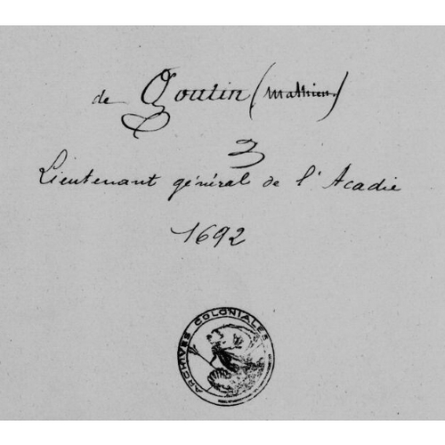 Our knowledge of de Goutin previous to his coming to Acadia is meagre. He himself refers to having participated in five campaigns, probably as a commissariat clerk, with the Régiment de la Couronne. He secured his appointment to Acadia through the influence of the Marquis de Chevry, a director of the Compagnie de la Pêche Sédentaire de l’Acadie, whose father he had previously served as secretary.