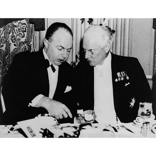 An invitation from King to attend a dominion–provincial conference in Ottawa in mid January 1941 soon raised Hepburn’s spirits. The purpose of the meeting was to discuss the report of the Rowell–Sirois commission, which had recommended a major overhaul of federal and provincial powers. In return for unfettered access to personal and corporate income taxes and succession duties, the federal government would assume all provincial debt, take over responsibility for unemployment relief, and allocate equalization grants to the provinces. In extending the invitation, King observed, “The Report commends itself strongly to our judgment.” When the conference opened, Hepburn quickly assumed the mantle of chief defender of provincial rights. He ridiculed the report as the “product of the minds of three professors and a Winnipeg newspaper man” and deplored the idea that “we should be fiddling while London is burning.” His most serious objection, however, was a substantive one: acceptance of the report would constitute “a surrender to a central authority of rights and privileges granted by the British North America Act.” Joined by premiers William Aberhart* of Alberta and Thomas Dufferin Pattullo of British Columbia, Hepburn stopped the conference in its tracks; the three provincial leaders were willing to discuss how the provinces could aid the war effort, but only if the agenda was not tied to the Rowell–Sirois report. King feared that the Ontario premier would call an election on provincial rights, and had he done so that spring, Hepburn might well have won. He was still master of the provincial scene, as witnessed by the ovation he received from his backbenchers when he brought in yet another budget surplus in March. Nixon, among others, urged him to go to the people, but Hepburn delayed, convinced that it was not appropriate to hold an election in wartime. Privately, he was still lobbying for a service position overseas; to his dismay, none was forthcoming.