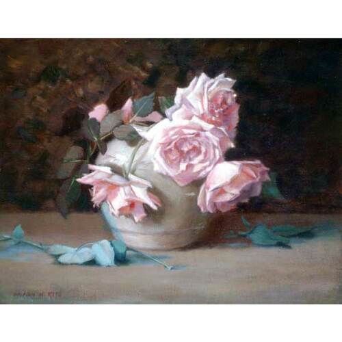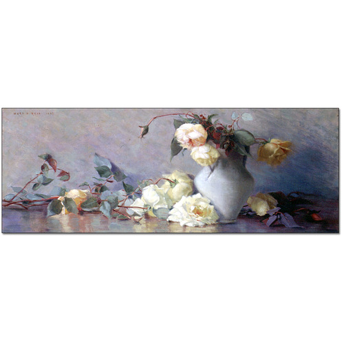 Reid’s oeuvre consists almost exclusively of easel paintings and a few surviving watercolours, but also includes a small number of marouflée landscape murals. The most admired of these murals was a view of the Humber River done for the town hall of Weston (Toronto) in 1912–13. She was, however, best known as a painter of floral still lifes, and by 1890 she was widely considered the pre-eminent flower painter in Canada. Critics particularly liked her sophisticated infusion of “character” into the straightforward botanical accuracy emphasized by most of her Canadian predecessors in this genre. As well, she regularly exhibited paintings of gardens, meadows, and other domesticated landscapes, night scenes, and, less frequently, studio interiors and figure studies. Along with a superficial examination of Impressionism, especially in her work of the 1880s and 1890s, she developed an enduring interest in a restricted range of colours to evoke a poetic subjectivity in her paintings, as in A study in greys, done about 1913. These were characteristics of the tonalist aesthetic found throughout North American art of the late 19th and early 20th centuries. Reid’s attraction to such a palette was reinforced by the paintings of Diego Velázquez, which she had studied and admired in Madrid in 1896. Her work also incorporated elements from the aestheticism of American artist James Abbott McNeill Whistler. These included oriental motifs, which sometimes appear in her still lifes and interior scenes, for example in Chrysanthemums: a Japanese arrangement (painted around 1895), and the occasional use of titles to suggest parallels between visual art and music, as in her Harmony in grey and yellow (1897). More than most contemporaries, Reid produced work that exemplified the decorative sensibility that was also prevalent in North American art. In this respect she was supported by critics such as Hector Willoughby Charlesworth* of Saturday Night, who described Reid’s paintings as “exquisitely refined.” In explaining the idealized feminine sensitivity that he found in her works, however, he resorted to stereotype, emphasizing that she was a model of humble and gracious womanliness – the perfect helpmate to her more famous husband. Reid said or did little to contradict this image. “Nothing can tempt her to talk about her pictures,” Marjory Jardine Ramsay MacMurchy* wrote in the Globe in 1910. Yet Reid clearly saw herself as a professional artist. This perception would be echoed in a memorial poem published in 1921 in the Daily Mail and Empire and reprinted in the Canadian Theosophist (Toronto): “Lived she to work and bless; / This was her heart’s delight.” In the absence of firmer documentation, however, little else can be said of Reid personally, and the two major portraits of her by her husband provide only tentative clues.