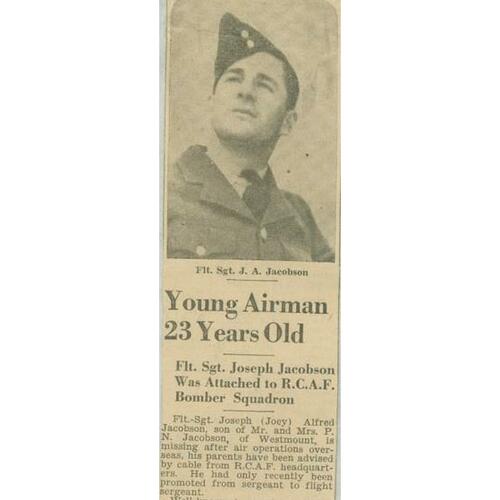 JACOBSON, JOSEPH ALFRED, letter writer, diarist, and air force officer; b. 17 Feb. 1918 in Montreal, son of Percy Nathaniel Jacobson, a businessman and playwright, and May Naomi Silver, a children’s bookstore proprietor; d. unmarried 28 Jan. 1942 near Lievelde, Netherlands.