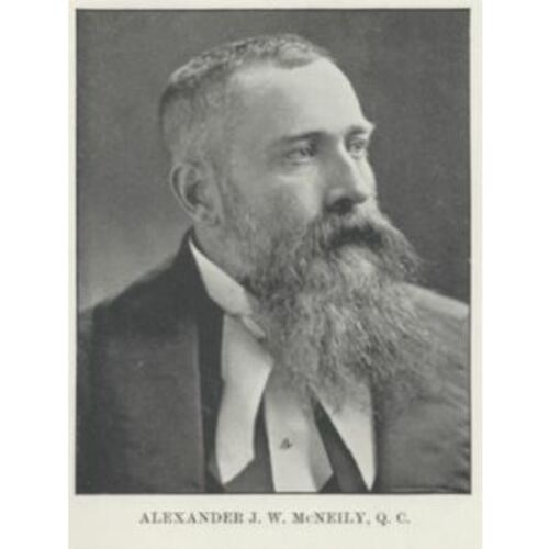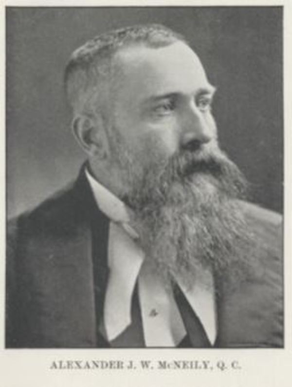 Alexander McNeily and his brother, Isaac Robert, arrived in Newfoundland with their widowed mother in 1849. She was the eldest daughter of Alexander Whiteford of Fair Head (Northern Ireland), who came the next year with his large, close-knit Ulster and Wesleyan Methodist family. McNeily was schooled at the General Protestant Academy and returned to Ireland to study at Queen’s College, Belfast, and at Queen’s University in Ireland. He was subsequently articled to Hugh William Hoyles*, was called to the bar in 1870 (qc 1880), and established a successful law practice with his brother. McNeily’s marriage to the daughter of James Johnstone Rogerson*, Rogerson’s marriage to McNeily’s aunt, the poet Isabella Whiteford*, and the marriage alliances of other relations linked Alexander to an influential circle of merchants and professionals.