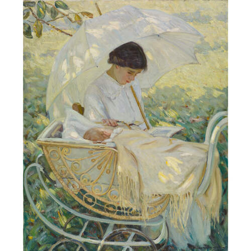 Primarily a painter of working women and maternal themes in outdoor settings, McNicoll drew her subject-matter from the tradition of Impressionist women painters such as Berthe Morisot and Mary Cassatt, while acknowledging the “new woman” of the modernist age. Works such as Under the shadow of a tent (c. 1914) and Young mother in the shade (c. 1914) are especially effective in representing intimacy and bonding between women and the changing representation of maternity. A reviewer in the Family Herald and Weekly Star noted that “her style is broad and simple and she follows the modern school of sunlit effects without any affectation, but absolute sincerity.” Contemporary women artists such as Florence Carlyle, Laura Muntz Lyall, and Emily Carr serve to position McNicoll’s art within the broader community of serious female artists whose exploration of female experience, nature, and techniques of painting have been largely marginalized within the history of Canadian art.