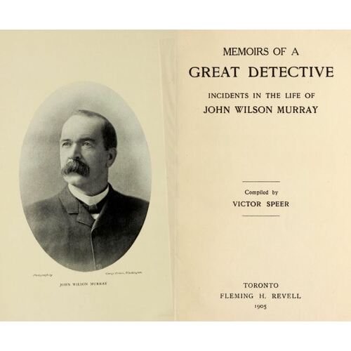 Murray’s Memoirs of a great detective: incidents in the life of John Wilson Murray was first published in London in 1904. Victor Speer’s involvement is not mentioned in this version, but he is identified (as compiler and editor respectively) in the Toronto and New York editions of the following year. Selections from the memoirs appear in the two modern editions, Memoirs of a great Canadian detective: incidents in the life of John Wilson Murray (Don Mills [Toronto], 1977) and Further adventures of the great detective: incidents in the life of John Wilson Murray (Don Mills, 1980).