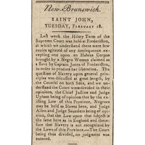 In 1799 Nancy brought a writ of habeas corpus “to procure her liberation,” stated the Royal Gazette (18 Feb. 1800). At trial she was defended pro bono by anti-slavery lawyers Ward Chipman* and Samuel Denny Street*, who would later file a writ of habeas corpus to free Richard Hopefield Jr, the son of Statia*, another enslaved woman. Nancy’s owner, Jones, was represented by Jonathan Bliss*, John Murray Bliss*, William Botsford*, Charles Jeffery Peters*, and Thomas Wetmore*. The case was heard by judges Isaac Allan, George Duncan Ludlow*, John Saunders*, and Joshua Upham*. Of the four, only Saunders did not own slaves; a close reading of his papers suggests, however, that he had interests in the commerce of human beings in Virginia.