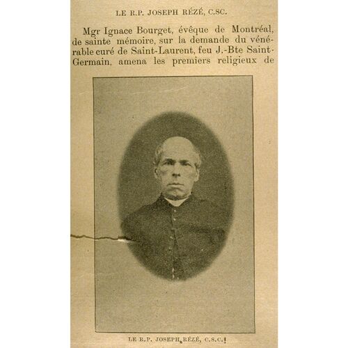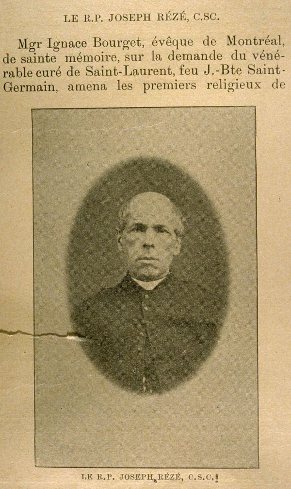 In 1826 Joseph-Pierre Rézé entered the Collège de Château-Gontier in France. Choosing the priesthood as his vocation, he did the final two years of the classical program (Philosophy) and studied theology at the Grand Séminaire du Mans. Ordained priest on 9 June 1838, he served two years in parish ministry before seeking admission to the Congregation of Holy Cross. He took his vows on 15 Aug. 1842 and concentrated his energies on educating the young. In the spring of 1849 Rézé was made superior for the religious of Holy Cross in Lower Canada, who had come to Saint-Laurent on Montreal Island in 1847 at the request of Bishop Ignace Bourget* and the local parish priest, Jean-Baptiste Saint-Germain*.