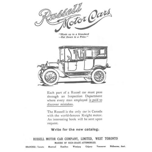 In 1909 Russell struck a deal with the Daimler Motor Company Limited of England for the Canadian rights to the state-of-the-art Knight sleeve-valve engine, which powered Daimler and other European luxury cars. For Russell, the driving machine that bore his name was going to be the “Daimler of the Dominion,” equal, if not superior, to any manufactured in the world. The first Knight-equipped Russell appeared in 1910, and the company started to move upscale. To increase CCM’s capital and to reflect the fact that the manufacture of motor cars was now its principal activity, Russell and the board of directors decided to reorganize. In April 1911 they changed the name to the Russell Motor Car Company Limited, but continued to make bicycles, skates, and other products under the CCM brand.