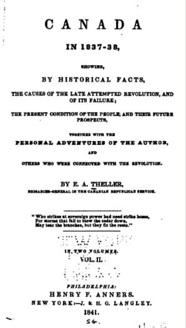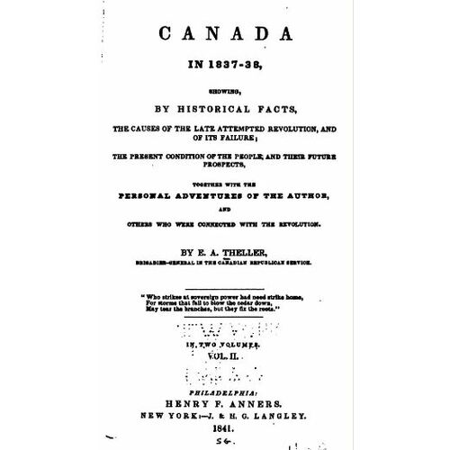 Edward Alexander Theller is the author of Canada in 1837–38, showing, by historical facts, the causes of the late attempted revolution, and of its failure; the present condition of the people, and their future prospects, together with the personal adventures of the author, and others who were connected with the revolution (2v., Philadelphia and New York, 1841).