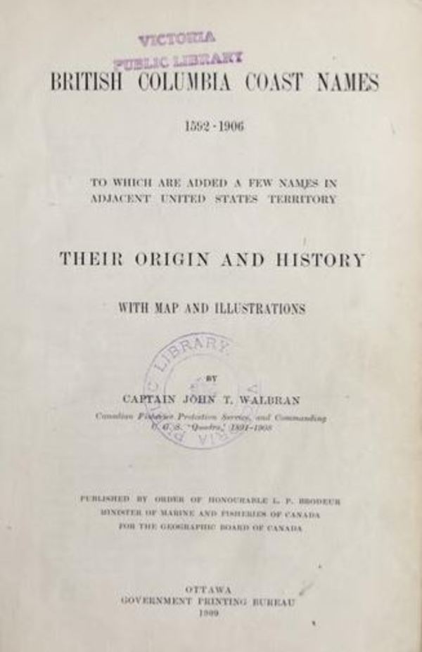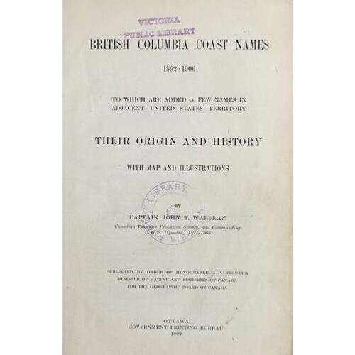 Walbran’s British Columbia coast names, 1592–1906 was first published in Ottawa and was reprinted, with an introduction by G. P. V. Akrigg, in Vancouver in 1971.