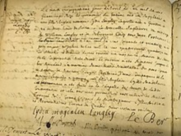 Des influences discrètes mais décisives amenèrent Lydia Longley du presbytérianisme au catholicisme, puis à la vie religieuse : le 5 août 1695, Jeanne Le Ber se fit recluse volontaire à la Congrégation de Notre-Dame, et Lydia fut marquée par la générosité de la jeune fille et par la cérémonie de réclusion ; Pierre Le Ber se préparait à se joindre aux Frères hospitaliers de la Croix et de Saint-Joseph, dont il avait été, avec François Charon* de La Barre et Jean Fredin, le cofondateur ; de plus, Mary Sayward*, autre captive anglaise avec qui Lydia se lia d’amitié, s’était déjà convertie au catholicisme le 8 décembre 1693. Quand Lydia exprima son désir de devenir catholique, on la confia à Marguerite Bourgeoys* pour son instruction religieuse. Le 24 avril 1696, la jeune fille fit solennellement acte d’abjuration de sa foi, dans la chapelle de la Congrégation de Notre-Dame. Le même jour, elle reçut le baptême et fut nommée Lydia-Madeleine, d’après sa marraine, Marie-Madeleine Dupont de Neuville, épouse de Paul Le Moyne* de Maricourt et cousine de Jeanne Le Ber.