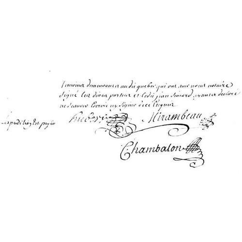 Après le décès de Gilles Rageot* survenu au début de 1692, le commerçant Chambalon avait reçu de Champigny [Bochart] une commission de notaire royal, confirmée par Louis XIV le 10 avril 1694. Chambalon exerça jusqu’à sa mort, et fut le notaire le plus occupé de son temps. Son greffe compte près de 4 000 minutes. Allié par sa première femme à la bourgeoisie du pays, il eut la clientèle de l’élite québécoise, et ses services furent souvent requis par les gouverneurs et les intendants. Il ne chercha pas à cumuler les offices, et n’apparut jamais comme praticien devant le conseil.