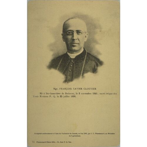Cloutier, François-Xavier, professeur, prêtre catholique et évêque, né le 2 novembre 1848 à Sainte-Geneviève-de-Batiscan, Bas-Canada, fils de Jean Cloutier, cultivateur, et d’Olive Rivard ; décédé le 18 septembre 1934 à Trois-Rivières, Québec.