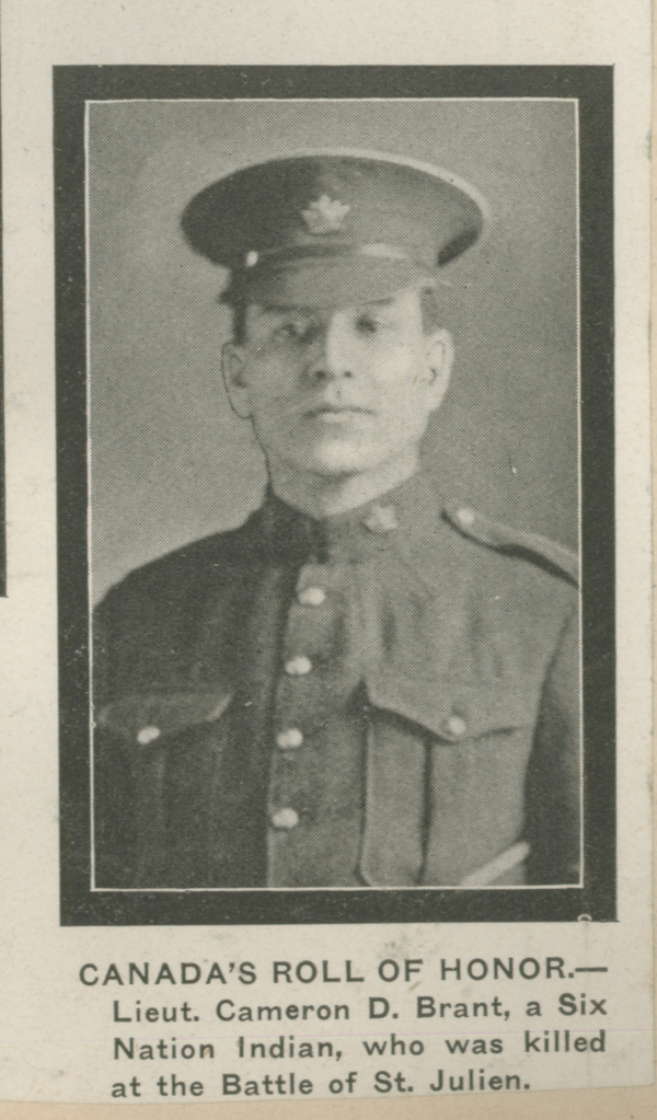 Cameron Dee Brant fut parmi les premiers des quelque 300 hommes des Six-Nations à s’enrôler dans l’armée canadienne pendant la Première Guerre mondiale et le premier des 30 qui moururent au combat. Au cours d’une cérémonie organisée par le maire de Brantford et d’autres notables du lieu, le comté de Brantford lui rendit hommage, comme le conseil héréditaire des Six-Nations. En 1919, à l’église méthodiste de New Credit, les Mississagués dévoilèrent une plaque commémorative en l’honneur du lieutenant Cameron D. Brant, le guerrier mohawk qui avait vécu et prié parmi eux.