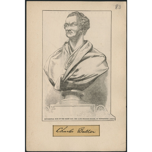 Décrit par l’historien Thomas Carlyle comme un homme aux « principes élevés et [à la] conduite honorable » qui avait l’« air enjoué, aimable et charmant », Charles Buller possédait l’« authenticité », la « probité et le savoir-vivre parfaits » de son père, employé de l’East India Company, de même que l’esprit et l’imagination de sa mère, une personne « gracieuse, désinvolte, ingénieuse [et] intelligente ». Il étudia à Harrow de 1819 à 1821 puis, jusqu’en 1823, suivit des cours pendant plusieurs trimestres à l’University of Edinburgh. De 1822 à 1825, il reçut, comme son frère Arthur William*, des leçons particulières de Carlyle. Ce dernier dut se remettre au latin et au grec pour se maintenir au niveau de Charles, « un prodige [...] fort docile, intelligent, joyeux et bien apprécié ». Buller obtint son baccalauréat ès arts du Trinity Collège de Cambridge en 1828, puis se consacra à l’étude du droit. On l’admit au barreau en 1831, mais il n’exerça pas immédiatement.