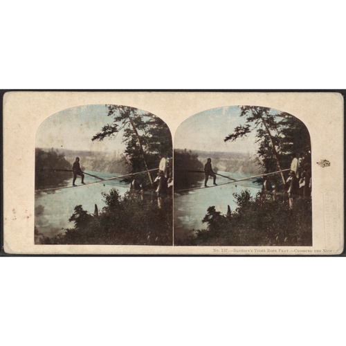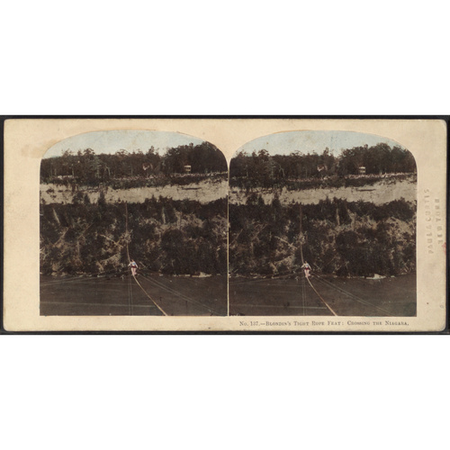 La région des chutes, particulièrement du côté canadien, était devenue un immense piège à touristes qui attirait les visiteurs par dizaines de milliers. Après avoir admiré le panorama, ceux-ci voulaient assister à des exploits, et il y en avait eu à profusion depuis l’époque de William Forsyth*. Blondin proposait le plus grand exploit jamais accompli, mais son premier auditoire fut modeste. En effet, peu de gens croyaient qu’un homme puisse survivre à une telle entreprise et la plupart pensaient qu’il changerait d’avis et s’enfuirait. Un organisateur local fournit 1 300 pieds de câble de deux pouces en chanvre de Manille et des fils de haubans qu’on tendit au-dessus du ravin, à environ trois quarts de mille en aval des chutes canadiennes, entre un point qui surplombe le quai actuel du vapeur Maid of the Mist et le parc appelé White’s Pleasure Grounds, en aval de Prospect Point, du côté américain.