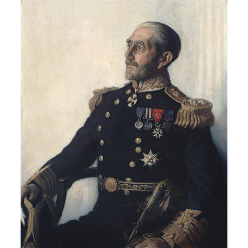 He was promoted to Rear Admiral in May 1908; in this photograph his uniform has one broad ring and one narrow ring on the sleeve indicating the rank of Rear Admiral. Photographer unknown.