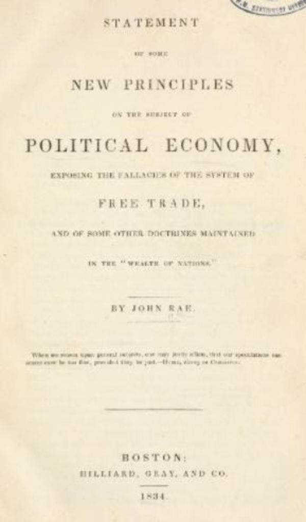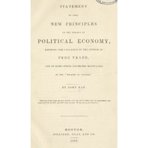 Entre temps, Rae poursuivait la préparation de son livre. Il se rendit à Boston en 1834 et sur les conseils d’un certain nombre d’hommes de lettres, dont Alexander Hill Everett, le rédacteur de la North American Review, il décida de publier d’abord l’appendice comme une œuvre à part. L’ouvrage parut en 1834 sous le titre de Statement of some new principles on the subject of political economy exposing the fallacies of the system of free trade, and of some other doctrines maintained in the « Wealth of Nations ».