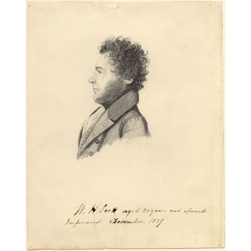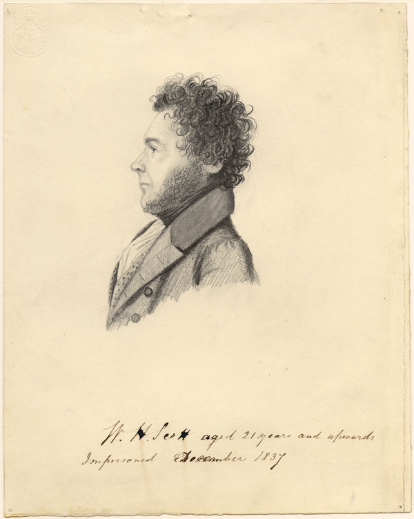 Scott se trouvait désormais dans une situation intenable. Sa tête mise à prix par lord Gosford [Acheson*], le 1er décembre 1837, d’une part, et menacé d’un procès pour trahison par les patriotes eux-mêmes, d’autre part, il n’avait d’autre choix que de fuir. De fait, peu avant la mi-décembre, Scott quittait Saint-Eustache dans le plus grand secret. Il se rendit d’abord chez son frère Neil à Sainte-Thérèse-de-Blainville (Sainte-Thérèse). Puis, caché dans un tonneau vide, il gagna Montréal où, le 19 décembre, il fut capturé et incarcéré à la prison de l’endroit. Entre-temps, sa résidence et son magasin furent mis à sac au cours de la bataille de Saint-Eustache. Inculpé de haute trahison envers le gouvernement, il ne fut libéré que le 10 juillet 1838, moyennant un cautionnement de £5 000.