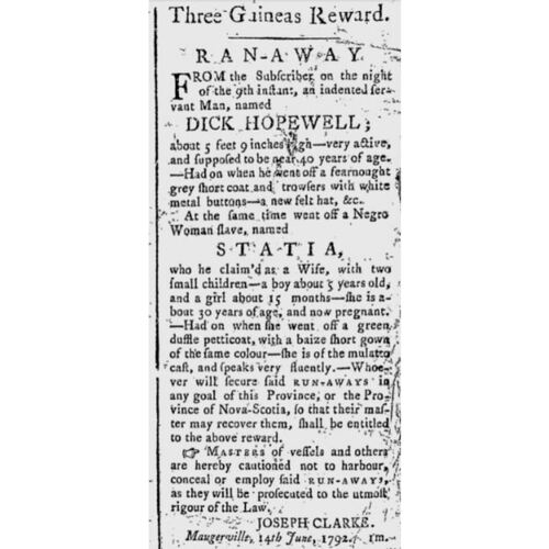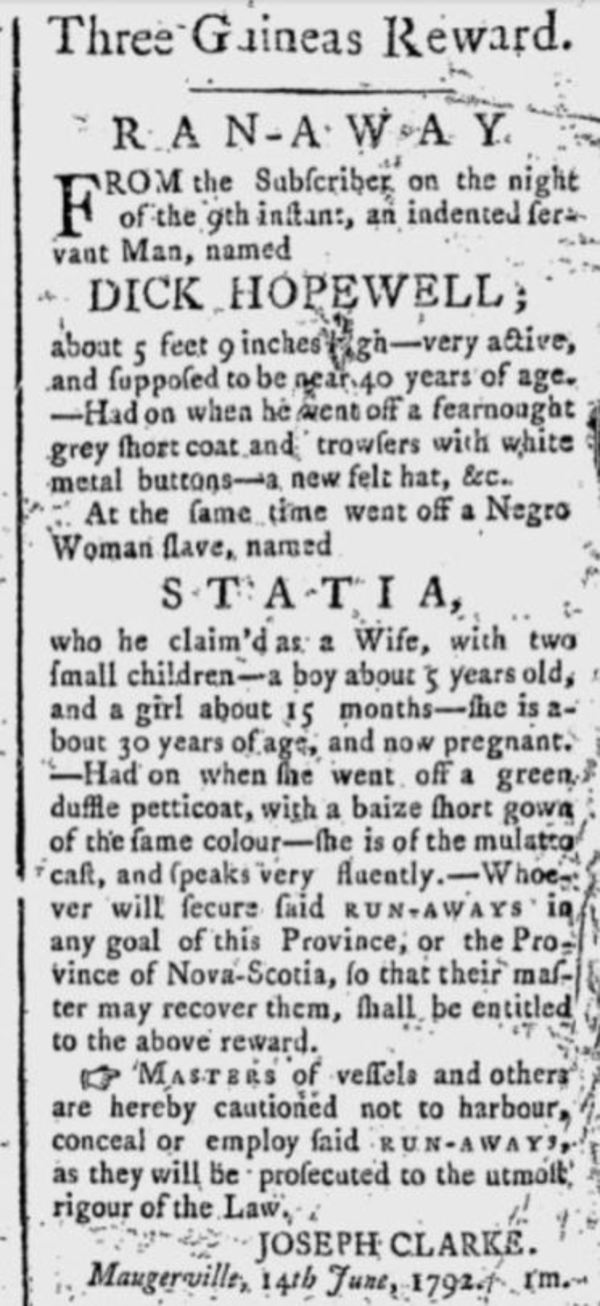 Statia et son mari préparèrent vite son évasion, puis s’enfuirent ensemble dans la nuit du 29 juin 1792. Clarke, apparemment peu préoccupé par le fait qu’il avait remis en esclavage une personne précédemment affranchie par le gouverneur de la colonie, publia un avis de fugue dans la Saint John Gazette and Weekly Advertiser du 6 juin 1792, qui décrivait Statia comme une femme d’une trentaine d’années « de race mulâtre » et capable de parler « avec grande aisance ». On y qualifiait Hopefield, nommé Hopewell par erreur, de « très actif, et vraisemblablement âgé de près de 40 ans ». Statia, enceinte au moment de sa fuite, était accompagnée de son fils de cinq ans et de sa fille d’environ 15 mois. On ne sait pas combien de temps la famille parvint à éviter la capture. Statia finit par être reprise et servit Clarke pendant « plus de deux ans », puis il la vendit à Joseph Hewlett. Elle était toujours l’esclave de ce dernier quand elle soumit sa déposition 12 ans plus tard, en 1805.