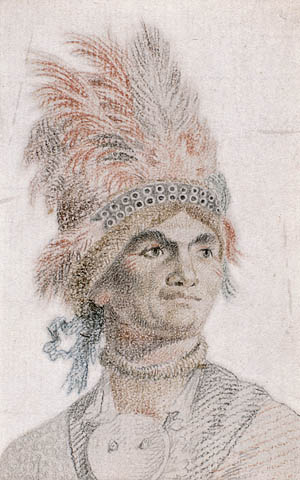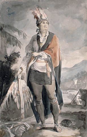 Après l’ouverture des hostilités dans les Treize Colonies, en 1775, Brant resta loyal envers le roi. À l’été, il se rendit à Montréal avec Guy Johnson et, en novembre, il s’embarqua pour l’Angleterre avec Johnson, Christian Daniel Claus* et d’autres pour exposer au gouvernement britannique leur pensée sur les affaires indiennes. Brant fut généralement mis en vedette : on le présenta à quelques-unes des personnalités les plus éminentes dans le domaine des arts, des lettres et du gouvernement, on l’initia à la franc-maçonnerie au sein de la Falcon Lodge et on fit peindre son portrait. Selon Boswell, il « fut frappé par l’aspect général de l’Angleterre, mais il avoua admirer surtout les dames et les chevaux ». Il n’en négligea pas pour autant le côté sérieux de sa mission. Son compagnon agnier Oteroughyanento (Ohrante) et lui firent part à lord George Germain, secrétaire d’État aux Colonies américaines, des plaintes des Agniers relatives aux empiétements sur leurs terres : « Il est très dur, déclara Brant, après que nous eûmes laissé les sujets du roi avoir tant de nos terres pour si peu, [de constater] qu’ils veulent nous enlever [...] les petits lopins que nous avons conservés pour faire vivre nos femmes et nos enfants. » Germain convint entièrement avec lui que les Indiens avaient été lésés par les Américains, mais il affirma que le gouvernement ne pouvait s’occuper de corriger la situation avant le règlement de la querelle avec les sujets rebelles du roi. Il espérait que les Six-Nations resteraient loyales, contre quoi elles pouvaient être assurées de recevoir « toute l’aide que l’Angleterre pourrait leur apporter ». Brant fut satisfait de cette promesse, qu’il répéta plus tard dans un discours aux Six-Nations. Au vrai, par suite des discussions qu’il eut avec de nombreux dirigeants anglais de diverses tendances politiques, il se convainquit plus que jamais que le bien-être des nations indiennes dépendait du maintien de leur alliance avec le roi.