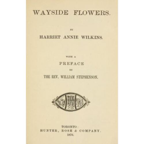 Harriett Annie Wilkins est l’auteur de : The acacia (Hamilton, Ontario, 1860 ; [2e éd.], 1863) ; Autumn leaves (Hamilton,1869) ; The holly branch (Hamilton, 1851) ; Victor Roy ; a Masonic poem (Hamilton, 1882) ; et de Wayside flowers (Toronto, 1876).
